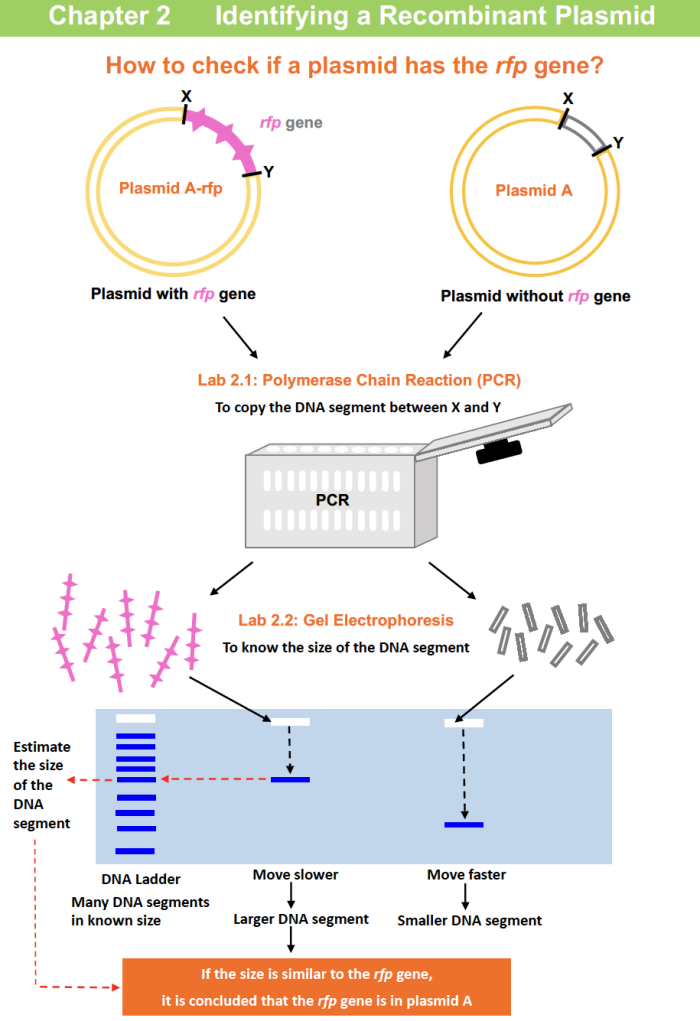 In Chapter 2, students use PCR to amplify sections of the non-recombinant plasmid and the recombinant plasmid with red fluorescent protein gene (rfp). The sizes of the amplified sequences in each plasmid vary and therefore can be used to identify the two plasmids.